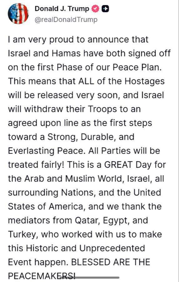 يشرفني أن أعلن أن كلاً من إسرائيل وحماس قد وقّعتا المرحلة الأولى من خطتنا للسلام.
